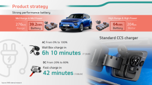 Kia e-Soul charging speed has a maximum of 100 kWm which means the battery can go from 20% ful, to 80% charged in only 42 minutes