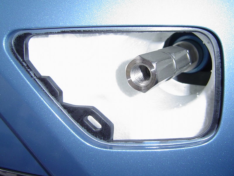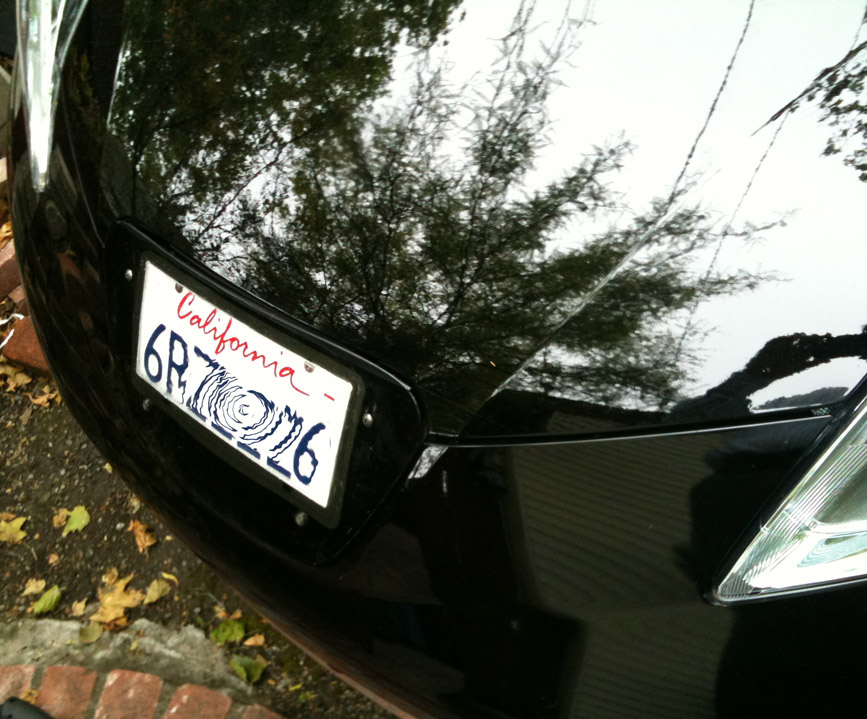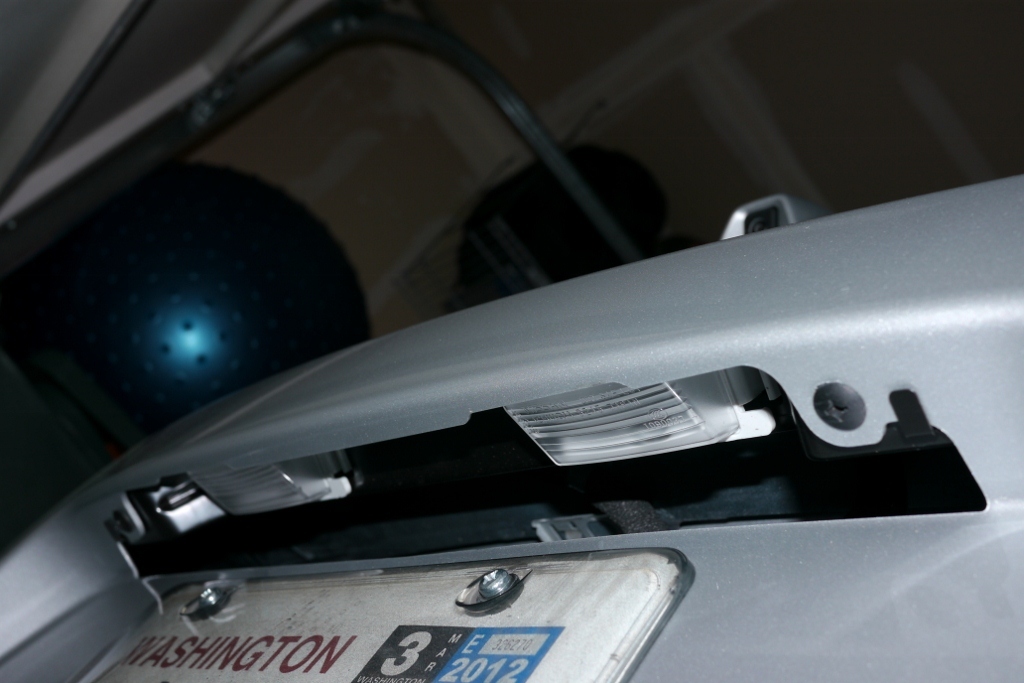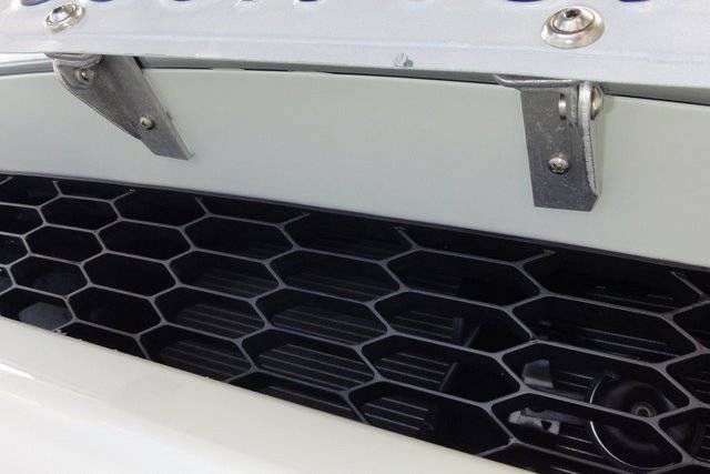 - Pics of gominigo‘s “no-hole” front license plate kit: license plate bracket is screwed into the tow hook receptacle.