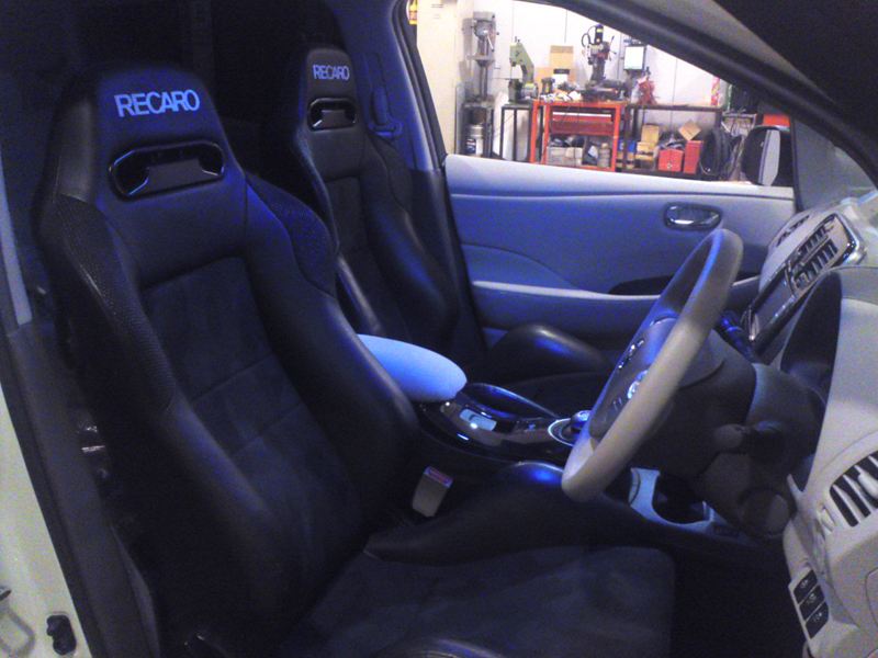 - White LEAF with mesh grille, blacked out headlights, black “ground effect” pieces, black door handles, Recaro seats: