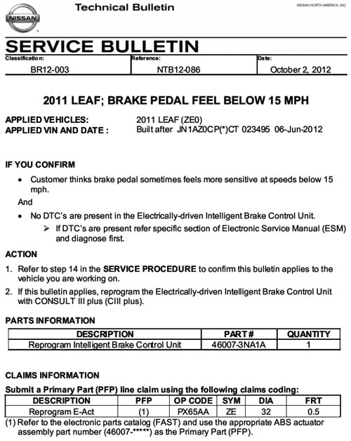 - Nissan Technical Bulletin NTB12-086: “2011 LEAF; Brake Pedal Feel Below 15 MPH”