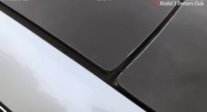 All Tesla Model 3 copies have roof rack mounts under weatherstripping next to the glass roof of the vehicle. Look for a small chalk ā€˜V’ in this image to indicate where the mount is hidden.